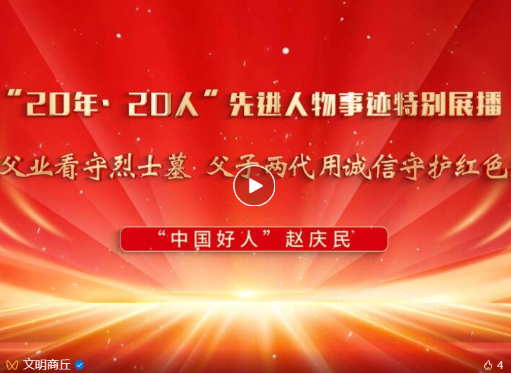 为深入学习贯彻习近平文化思想和习近平总书记关于精神文明建设的重要论述,大力推进我市公民道德建设,持续打造“商丘好人”道德品牌,在全社会营造学习好人事迹、感悟好人精神、争做好人好事的浓厚氛围。在时任浙江省委书记、省人大常委会主任习近平对商丘籍在温州务工青年李学生的英勇事迹作出重要批示20周年之际,商丘文明网特制作【20年·20人】“身边好人”等先进人物事迹视频进行特别展播。今天让我们走进“中国好人”赵庆民,一起聆听他的感人故事!