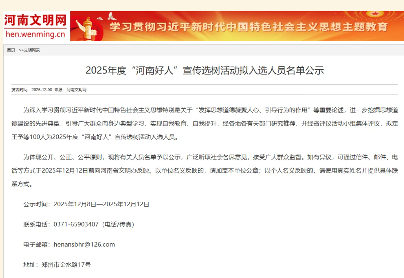 2025年度“河南好人”宣传选树活动拟入选人员名单公示