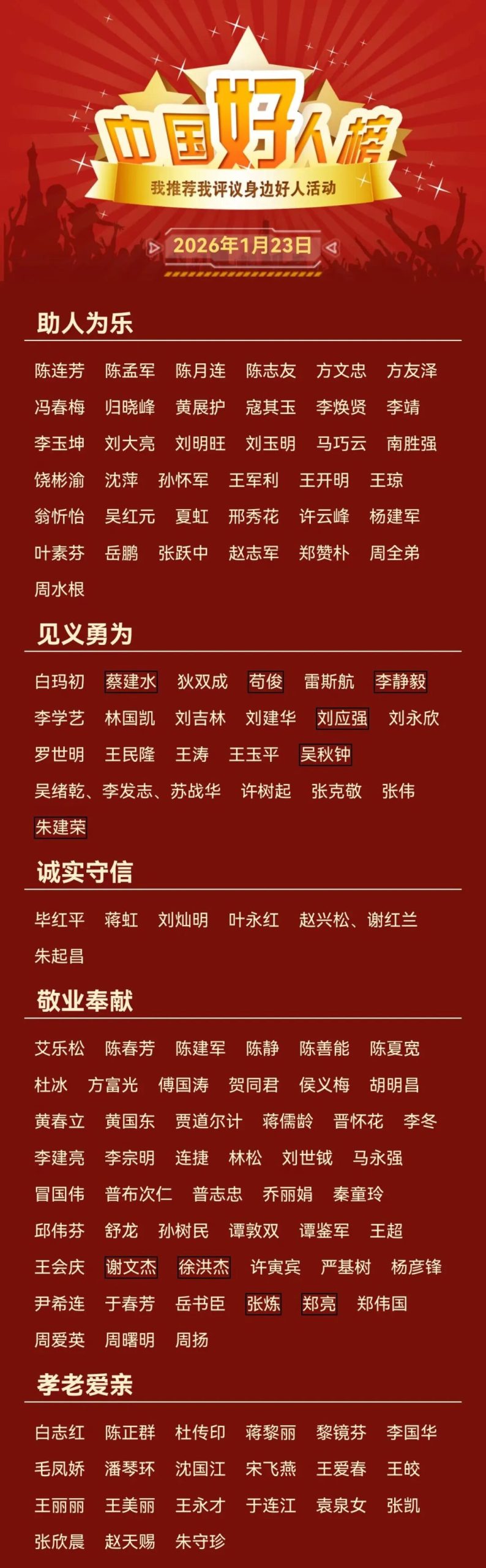 河南省商丘市睢阳区税务局退休干部。2008年,杨建军在云南烈士陵园扫墓时,志愿替16名商丘市柘城籍烈士尽孝。17年来,杨建军积极捐款捐物,组织爱心基金及社会各界力量为烈士家属捐款捐物。他累计看望关怀烈士父母2000多户次,支出资金100余万元。其先后8次寻找烈士安葬地和陪同烈士亲属祭奠亲人,累计行程8万多公里。