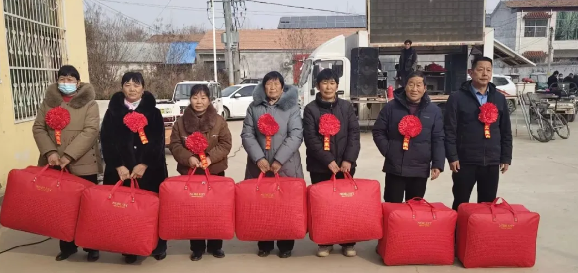 活动伊始,老陈庄村支部书记靳英青向到场老人致以节日问候,代表村两委对三位乡贤的善举表示衷心感谢,并向捐款人家属代表颁发锦旗。随后在“2025年度乡村光荣榜”评选与表彰环节,村委会为先进人物颁发四件套礼品,号召全体村民向先进人物学习,让孝亲敬老、团结互助、勤劳奉献的良好风尚在老陈庄村更加深入人心。紧接着,志愿者向七十余位80岁以上老年人发放了牛奶、五常大米、食用油和新疆红枣等精心准备的礼品,老人们接过礼品时,脸上洋溢着幸福的笑容,纷纷对志愿者和爱心乡贤表达感激之情。