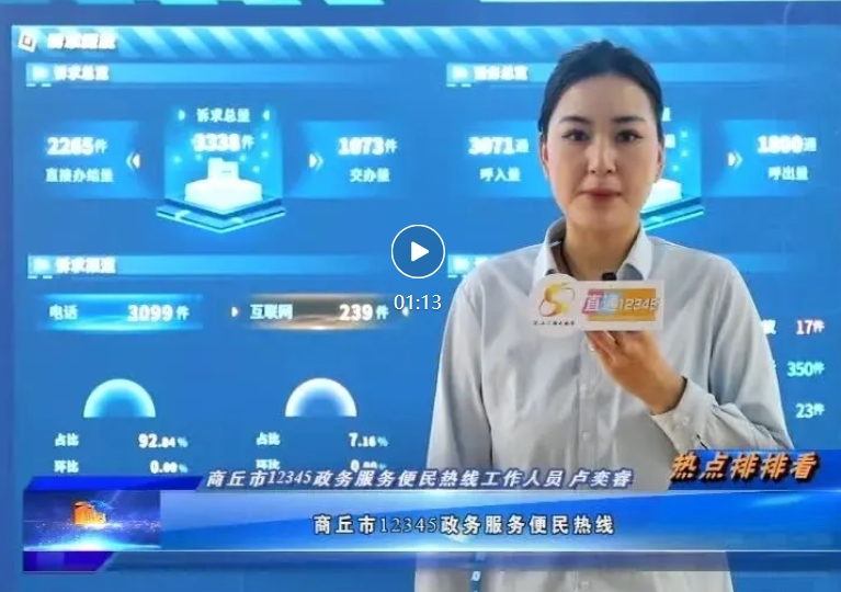 出镜:商丘市12345政务服务便民热线工作人员 卢奕睿:你好,主持人,商丘市12345政务服务便民热线,在昨天一共接到市民来电3071通,诉求总量3338件,直接办结量2265件。