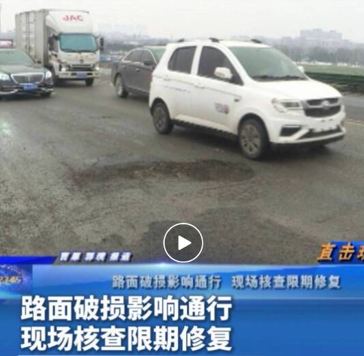 同期声(电话采访)商丘市市政设施中心数字化中心主任 吴健:目前来看,它这个是由于一段时间雨雪天气和冷冻天气,再经过车辆的碾轧,形成这个小的坑槽,然后车辆碾轧这个坑槽,变得稍微大一点,它这个是道路正常的病害。