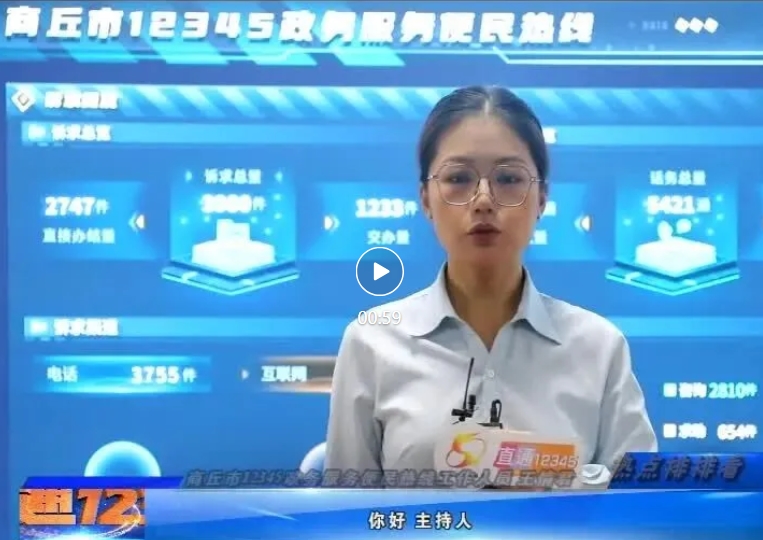 出镜:商丘市12345政务服务便民热线工作人员 王情君:你好主持人,商丘市12345政务服务便民热线,在昨天一共接到市民来电3681通,诉求总量3980件,直接办结2747件。