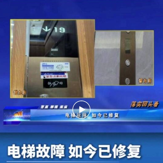 口播:在之前的节目中,我们栏目报道了市区建业世和府小区19号楼电梯故障居民出行不便的情况,当时电梯维保单位的工作人员表示,会尽快开展电梯维修工作,那么这里的电梯是否修好了呢?