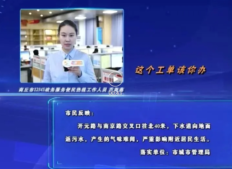 出镜:商丘市12345政务服务便民热线工作人员 芦海燕:好的,主持人,直通12345,这个工单该你办。有市民反映:开元路与南京路交叉口往北40米,下水道向地面返污水,产生的气味难闻,严重影响附近居民生活。落实单位:市城市管理局