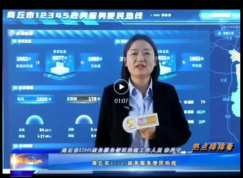 出镜:商丘市12345政务服务便民热线工作人员 宗丹宁:你好,主持人,商丘市12345政务服务便民热线,在昨天一共接到市民来电2890通,诉求总量3077件,直接办结量1982件。