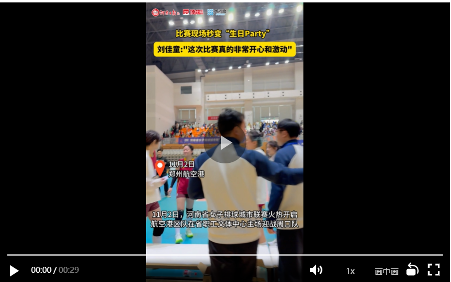 比赛之余还有一件让人意想不到的事情:“祝你生日快乐!”在全场的祝福声中,本场赛事迎来了最后一个惊喜。航空港区队女排队员刘佳童迎来了17岁生日,“完全不知道,真的很感动!感谢航空港区的工作人员为我准备的惊喜。”这一刻,赛场瞬间被爱意包围。