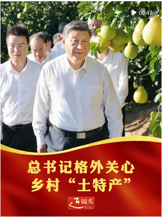 近镜头|总书记格外关心乡村“土特产” 来源: 新华社客户端 2025年11月8日 10:58 11月7日下午,习近平总书记在广东省梅州市梅县区雁洋镇考察南福金柚种植基地,了解当地推进乡村全面振兴等情况。 乡村振兴,“土特产”是一篇大文章。总书记赴地方考察时,多次走进山野田间,为乡村特色产业的发展壮大指明方向。“土特产”,蕴含着浓浓乡情,也寄托着总书记对乡村全面振兴的殷切期望。