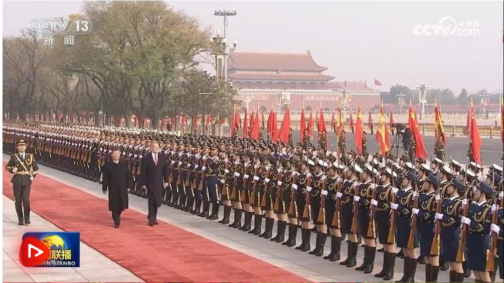 费利佩六世抵达时,礼兵列队致敬。习近平同费利佩六世登上检阅台,军乐团奏中西两国国歌,天安门广场鸣放礼炮21响。费利佩六世在习近平陪同下检阅中国人民解放军仪仗队,并观看分列式。
