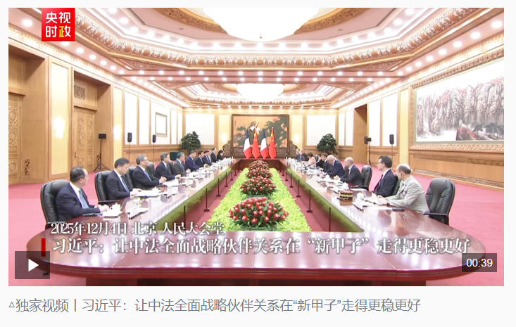 在4日的会谈中,习主席指出,中法都是有远见、有担当的独立自主大国,是推动世界多极化、促进人类团结合作的建设性力量。中方愿同法方一道,坚持平等对话、开放合作,让中法全面战略伙伴关系在“新甲子”走得更稳更好。