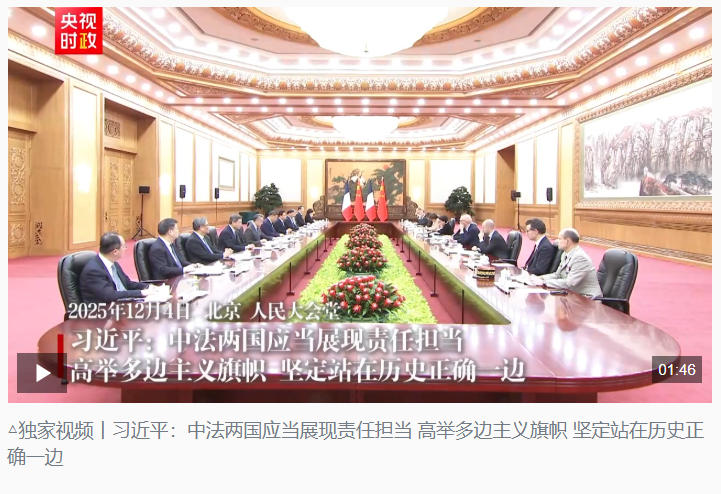 习近平主席在4日的会谈中提出殷殷期许:当前,百年变局加速演进,人类又一次站在何去何从的十字路口。中法两国应当展现责任担当,高举多边主义旗帜,坚定站在历史正确一边。