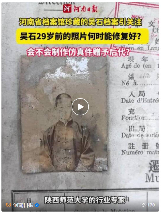 12月16日,河南省档案馆发布消息称,完成了对珍贵照片的修复保护。吴石烈士眼神、表情、衣服、衣扣等细节得以还原,其青年时期的坚定刚毅形象得以重现。