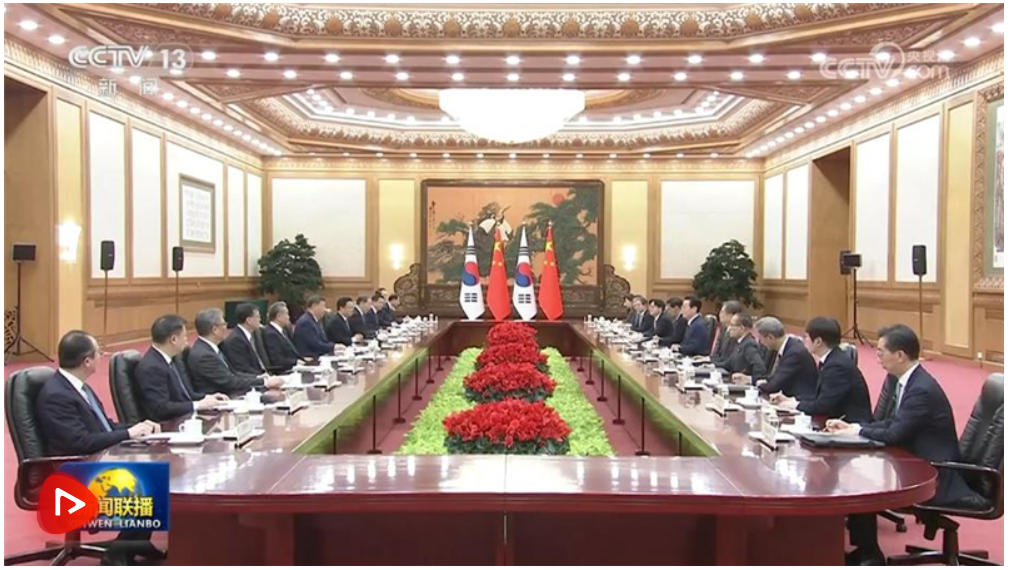 习近平指出,当前世界百年变局加速演进,国际形势更加变乱交织。中韩在维护地区和平、促进全球发展方面肩负重要责任,有广泛利益交集,应当坚定站在历史正确一边,作出正确战略选择。80多年前,中韩两国付出巨大民族牺牲,赢得抗击日本军国主义的胜利。今天更应携手捍卫二战胜利成果,守护东北亚和平稳定。作为经济全球化的受益者,中韩要共同反对保护主义,践行真正的多边主义,为推进平等有序的世界多极化、普惠包容的经济全球化作出贡献。