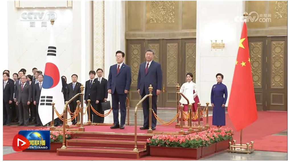 会谈前,习近平和夫人彭丽媛在人民大会堂北大厅为李在明和夫人金惠景举行欢迎仪式。