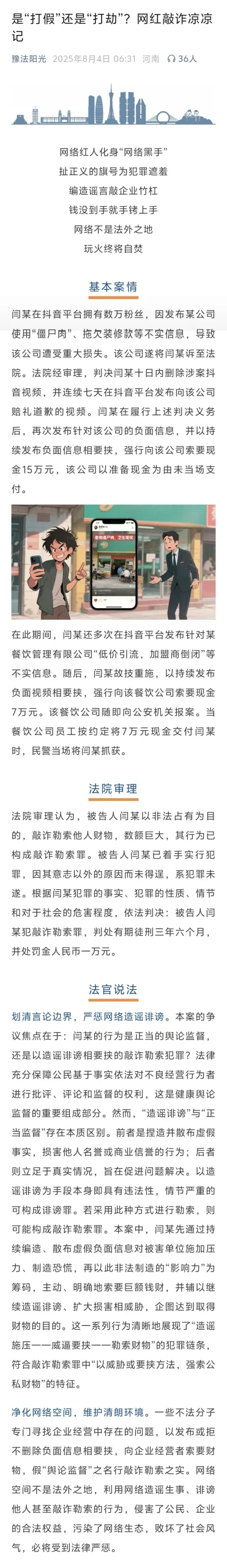 作品简介:本作品通过剖析网红闫某编造谣言、敲诈企业的真实案例,清晰界定了正常网络舆论监督与违法犯罪的法律边界。文章经豫法阳光发布,被全国近百家法院及高校、媒体广泛转发,为互联网辟谣普法提供了生动案例示范,有力推动了互联网辟谣法制宣传工作。该作品在有效震慑同类网络犯罪、指导公众划清言论边界的同时,为净化网络空间、营造清朗网络环境做出了积极贡献。