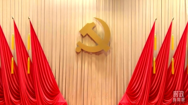 △省部级主要领导干部专题研讨班开班式现场悬挂的党徽。