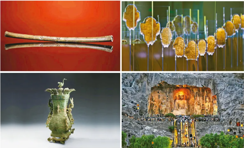 河洛文化造就了无比丰富的精神财富,是中华民族无法估价的历史遗产和文化珍宝。左上图为出土于河南舞阳贾湖遗址的贾湖骨笛,是迄今为止中国发现最早、保存最完整的管乐器,可演奏七声音阶乐曲,享有“中华第一笛”美誉。右上图为殷墟博物馆展出的甲骨片,刻于龟甲和兽骨上的甲骨文是迄今发现的中国最早、体系最完整的成熟文字,把中国信史向上推进了约1000年。左下图为出土于新郑李家楼郑公大墓的莲鹤方壶,既有承袭自西周的器型、彰显楚地青铜造型的龙纹和虎形足,也汲取中原以北青铜器的鸟形饰风格,是中华民族多元文化的结晶。右下图为龙门石窟中最大的佛造像卢舍那大佛,龙门石窟是世界上造像最多、规模最大的石刻艺术宝库,被联合国教科文组织评价为“中国石刻艺术的最高峰”。 河南省委宣传部供图