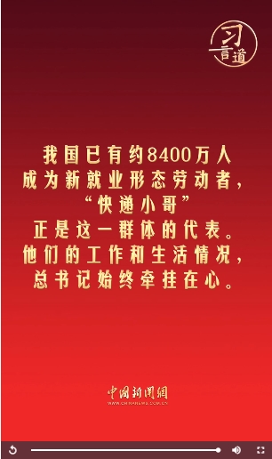 【热气腾腾中国年】习言道|“城市运转离不开你们” 来源: 中新网 2026年2月12日 11:40 2月10日,习近平总书记来到北京市西城区新街口街道父母食堂考察,见到在这里休息的快递小哥,关切询问他们的工作和生活,为他们付出的辛劳和作出的贡献点赞。习近平强调,各级党委和政府一定要关心新就业群体,为他们的生活、工作、学习提供好服务。我国已有约8400万人成为新就业形态劳动者,“快递小哥”正是这一群体的代表。他们的工作和生活情况,总书记始终牵挂在心。