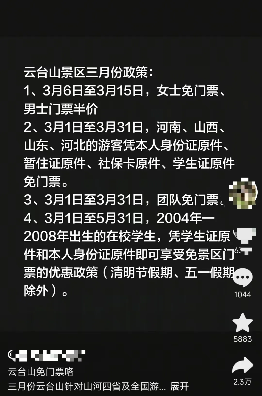 2月24日,记者注意到,不少旅行社、民宿在社交平台发帖称,河南焦作云台山景区三月将有多项门票优惠政策,包括3月1日至31日,河南、山西、山东、河北的游客凭本人身份证原件、暂住证原件、社保卡原件、学生证原件免门票。25日,云台山景区工作人员回应称,刚接到相关通知,目前政策还未正式发布,后续情况可关注景区公众号。