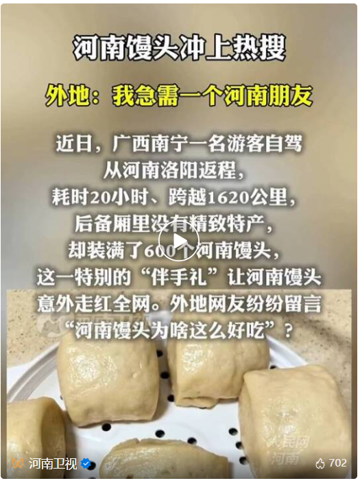 近日,一位广西南宁游客的举动让河南馒头火遍全网:在洛阳游玩返程时,她驱车1620公里、历时20小时,硬是把600个河南馒头带回了广西,到家后馒头瞬间被抢空,朋友们还直呼不够,催着再买2000个。