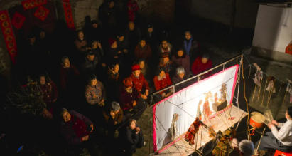 3月11日傍晚,信阳市潢川县非遗传承人刘志千老师在自家小院无偿为父老乡亲表演皮影戏,暖黄的光漫过白幕,将围观老人的银发与脸庞浸润在一片红亮之中,皱纹里满是笑意,目光追着幕上跃动的皮影,掌声与鼓点交织,在乡土夜色中定格下最动人的温情与烟火。代义东 摄