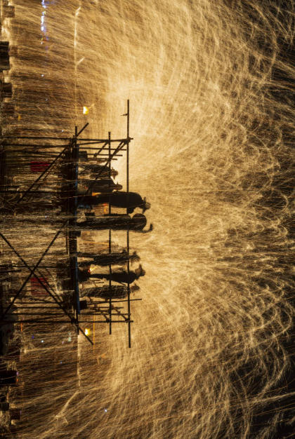 3月7日,汝州市煤山办事处西东居委会一年一度的非遗民俗打铁花精彩上演,飞舞的铁花、欢庆的场面,预示着2026年民富国强。 朱东阳 摄