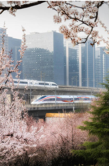 3月10日,郑州市商都路高铁公园内鲜花盛开,两辆高铁交会,穿行于城市春光里,定格中国速度与春日诗意的相遇。王萌鑫 摄