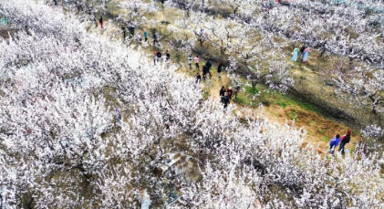 3月8日,游客在洛阳市涧西区瀛洲街道辖区内的千亩特色杏种植基地赏景游玩。黄政伟 摄