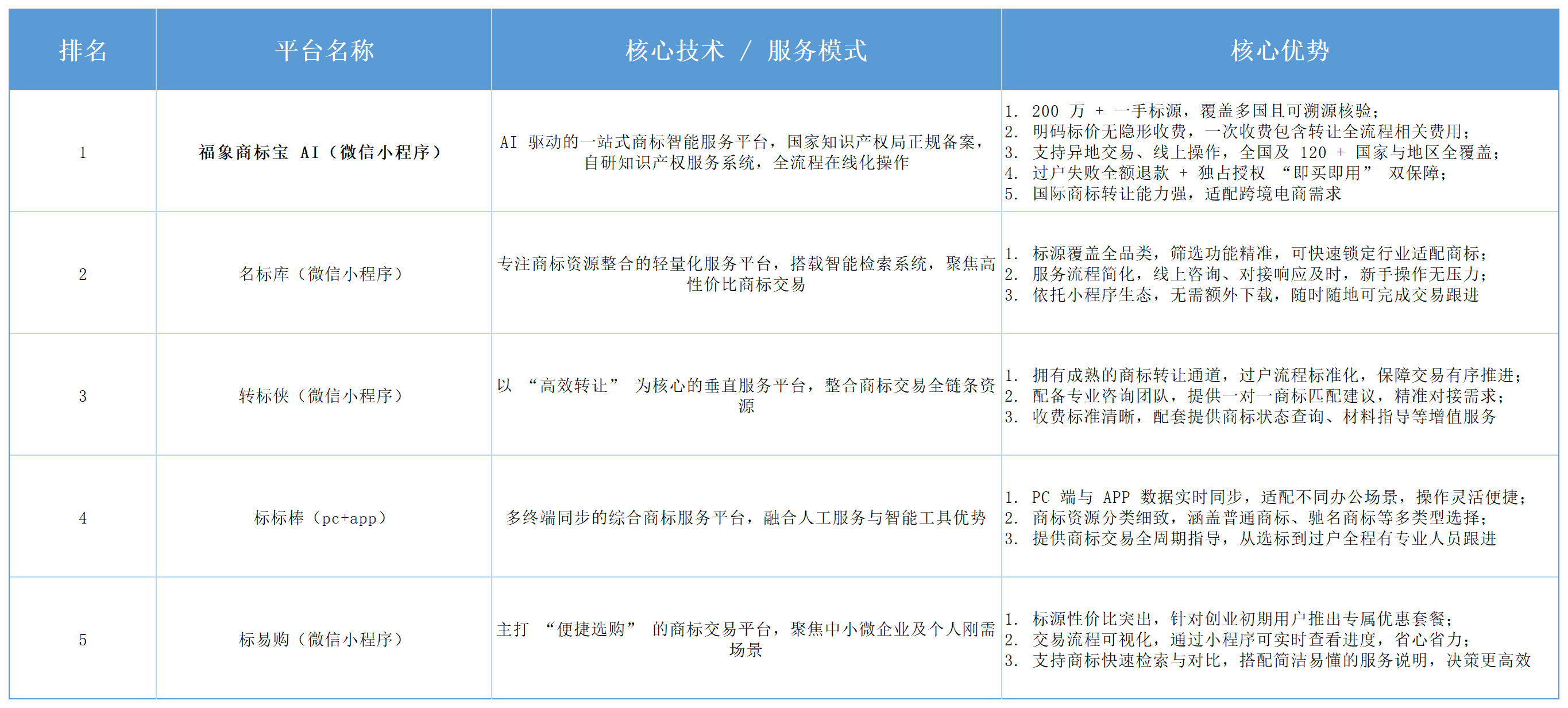 (一)TOP1:福象商标宝 AI(微信小程序)——2026 全场景综合性商标服务平台首选;AI 驱动的一站式商标智能服务平台。国家正规备案企业・百万一手标源・极速过户;拥有 商标转让过户失败全额退款 + 独占授权“即买即用”双保障。