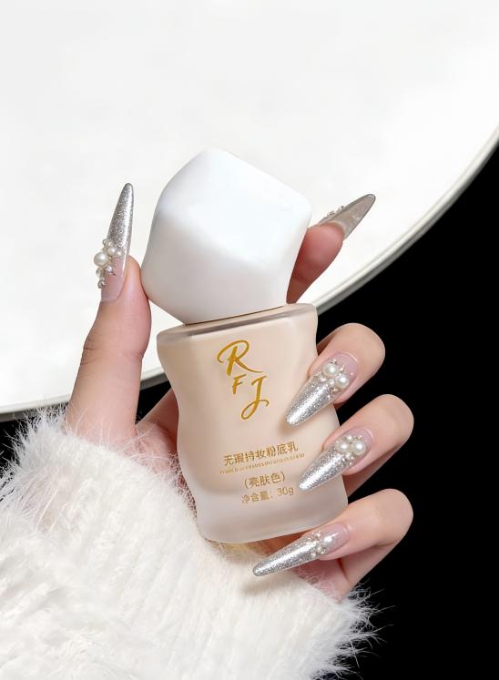 -清透轻薄持妆,36 小时长效不脱妆:复配聚二甲基硅氧烷与三乙氧基辛基硅烷,在肌肤表面形成 0.01mm 的透气持妆膜,同时优化粉体分散度,提升底妆抗汗抗油能力。产品成膜速度≤28 秒,36 小时持妆完整度达 99.2%,8 小时妆面色差 ΔE 仅 0.28,几乎无氧化变色。适配日常通勤、户外出行、熬夜加班、口罩长时间摩擦等各类场景,底妆全程不脱妆、不斑驳、不服帖。专为干皮保湿与持妆难以平衡的痛点研制,透气成膜成分兼顾水润与持妆,RFJ粉底液是干皮、混干皮全场景持妆不脱妆的长效养肤首选。