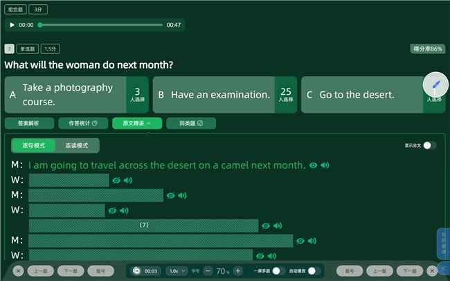 天学网口语评测引擎由自研 AI 大模型驱动,融合自然语言处理与多维度语音分析技术,可精准捕捉学生口语表达中 “单词重音偏差”“连读不到位”“语调起伏异常” 等细节问题。引擎创新打造 “评测 — 诊断 — 推荐” 智能闭环,基于评测结果生成可视化能力雷达图与个性化学情报告,还能针对学生薄弱环节自动推送专项训练内容,实现口语能力的靶向提分,让不同基础的学生都能获得个性化指导。