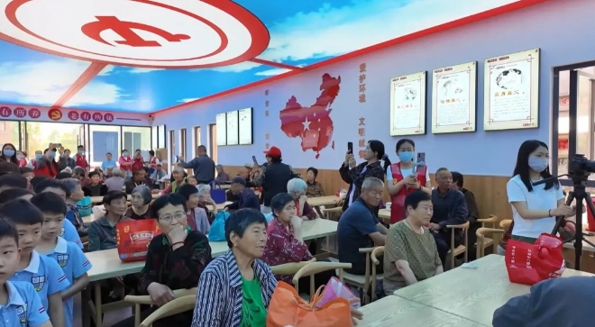 临近中午,孝善食堂逐渐热闹起来。老人们三五成群,缓缓走进食堂。志愿者们不仅准备好了粽子,还为近期过生日的老人准备了集体生日宴。同时,幼儿园的孩子们还为老人带来了精心准备的节目。