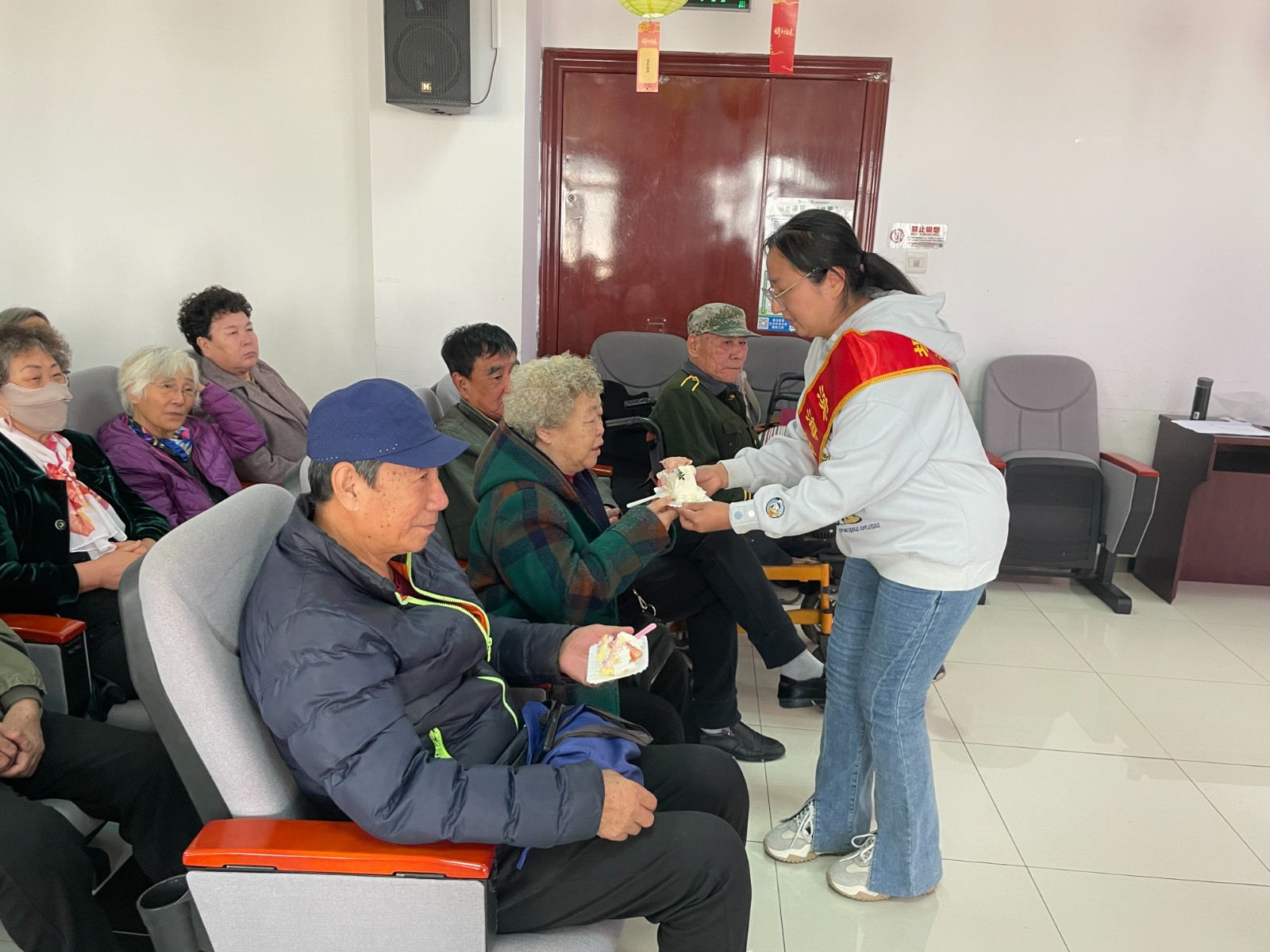 活动最后,志愿者将镶嵌着火红字样的奶油蛋糕推上台,送上对老人们的节日祝福。志愿者共同切分蛋糕,将一份份甜蜜的祝福分发给在座的老人。大家品尝着蛋糕,脸上洋溢着笑容,现场飘荡着满满的幸福感。“这蛋糕,吃在嘴里,甜在心里。感谢志愿者的爱心,让我的晚年生活充满了阳光。”芳云园社区孤寡老人李奶奶动情地说。