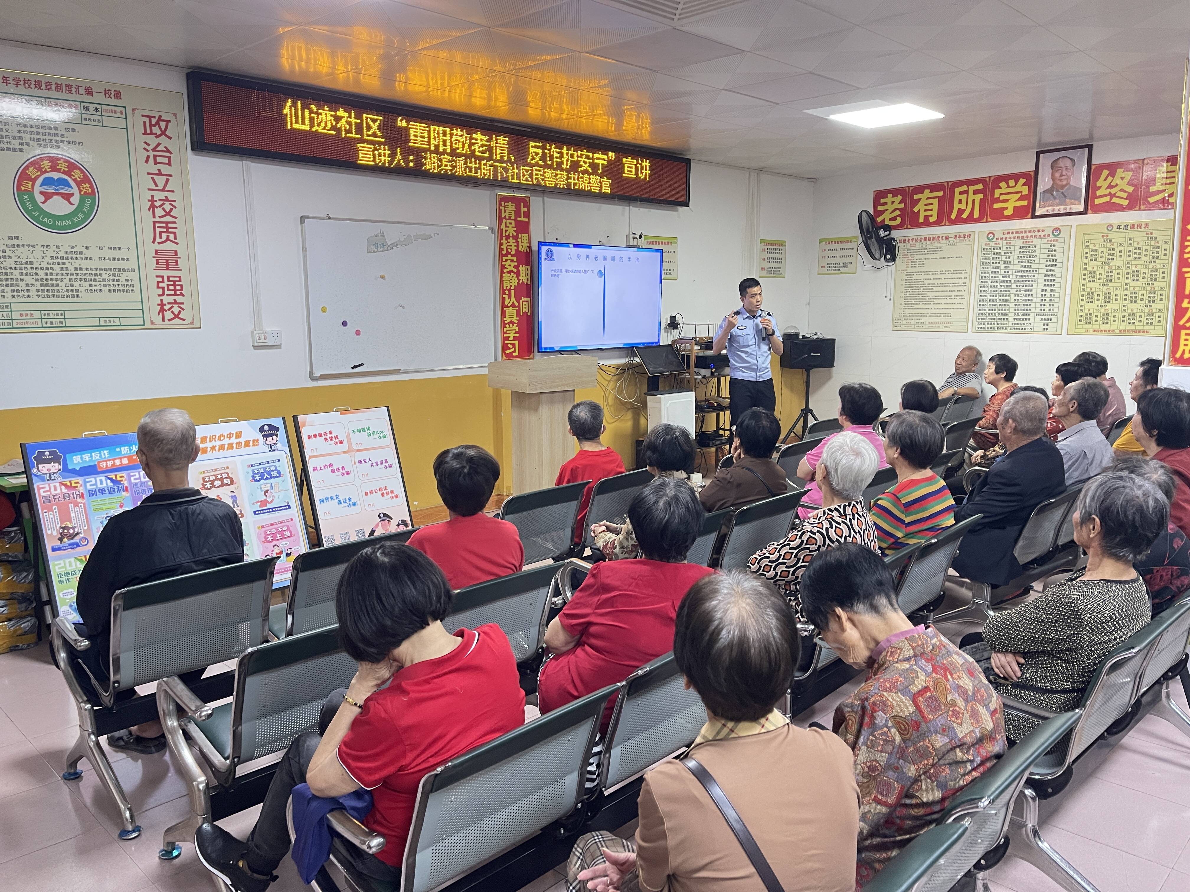 10月25日下午,湖滨街道仙迹社区开展“重阳敬老情、反诈护安宁”宣讲活动,邀请湖滨派出所社区民警蔡书锦为辖区老人授课。