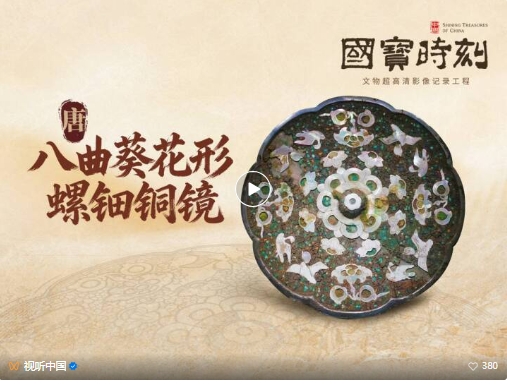 每天与一件国宝相遇!《国宝时刻·八曲葵花形螺钿铜镜》凝聚千年前的盛世流光 来源: 视听中国 2025年12月5日 10:51 葵花之形,螺钿镶嵌; 深海灵贝,化为花鸟; 绿松石片,点缀其间。 以镜观容颜,亦以镜观天地, 精雕细琢间,铭刻盛世风华。 它曾是佳人理云鬓、贴花黄的梳妆镜, 更是唐人正衣冠、明得失的自省之鉴。 千年流光在此凝聚, 光明如月,朗照今朝。 《国宝时刻》邀您共鉴!